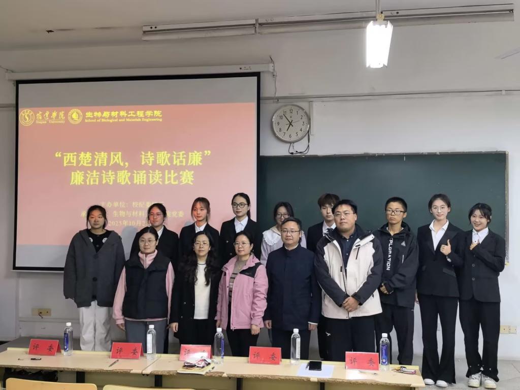 为深入贯彻落实廉洁教育理念,营造崇廉尚洁的校园文化氛围,10月28日晚,18:00,生物与材料工程学院党委在3104教室成功举办“西楚清风 诗歌话廉”廉洁诗歌诵读比赛。来自各二级学院党委的11组选手同台竞技,以诗歌为载体,传递廉洁精神,展现青春风采。
