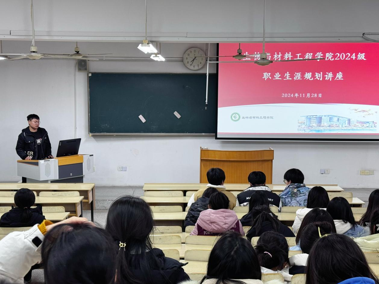为进一步提升学生的职业生涯规划意识,帮助学生科学认知职业发展,制定合理的职业目标和阶段规划,不断提升职业素养和专业技能,2024年11月28日,我院辅导员蒋月亮老师在3-504教室举办了生物与材料工程学院2024级职业生涯规划主题讲座。